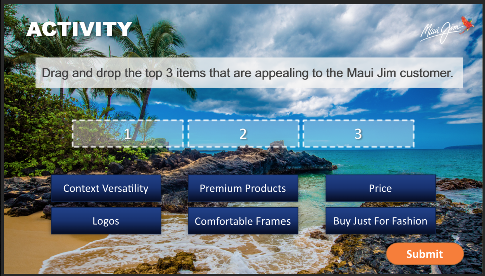 The key objectives for this project were to educate the user on the three brand pillars and I also included an activity to practice an elevator pitch based on the information provided and a brief knowledge check at the end to drive the learning objectives home.
